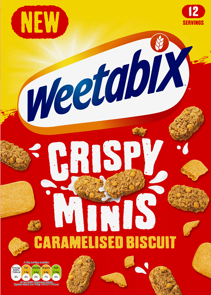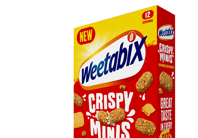 Dive in! Weetabix crispy minis are delicious and crunchy bites made with golden wholegrain wheat. High in fibre and crammed with caramelised biscuit pieces. It’s a super tasty breakfast that’ll go down a treat!